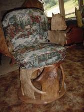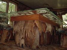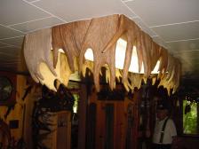 The glass table top is 1/2" thick plate glass with a 1'" bevel around it the entire border... the underside is sand blasted with moose and forest tree's, the table is slighly over 7' long and has a shadow box built in the center. ALL carvings seen are also included but could also be replaced with anything you desire. On the underside of the table are over 25 moose palms hanging down around the whole table. The chairs are matched sets of moose antlers that cradle the cushions that have tapestry of a wildlife scenes, the two end chairs have antler arm rests and all the chairs have a solid oak platform that even more moose palms hang down as support. Also included with the table is the ceiling light, theere are several moose palms surrounding the light that cast shadows on the walls of the camp for atmosphere. The table is breathtaking and would be the perfect addition to your rustic camp,home or office, for more pictures plese check the other listing for this item, for more information please contact jackbrown@bonecarver.com 716-498-3035 ....shipping is not included, pick up at location only. |